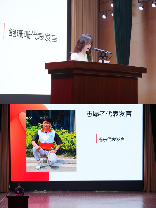 打破了四项校运动会纪录的运动员代表鲍珊珊上台发言,她那充满力量而又温柔的发言深深打动了在场的每一个人。她在言语中透露出的不仅是对体育的尊重和热爱,还有对挑战自我极限的坚定信念。动人的发言让整个会场沉浸在温馨和谐的氛围之中。与此同时,志愿者代表杨东则以他那充满生活气息的故事,为大家展现了志愿者工作的另一面。他讲述了在深夜搬运物资时、在烈日下保障运动员后勤时的故事,用乐观和坚持传递出一种特别的温暖和力量。