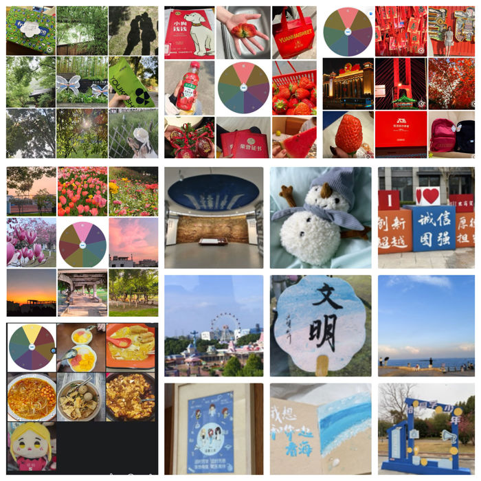 活动期间,以捕捉生活美好为主题的探索之旅在春光里开展。同学们随机抽取一种颜色,在校园内外、生活点滴中用心寻找符合该颜色的场景或物品,并拍照集齐九宫格发布在社交平台。这一过程,不仅是简单的色彩收集,更是一次对生活细致入微的观察与感悟。同学们将目光从繁忙的学业暂时移开,聚焦到身边那些常常被忽略的美好瞬间:一株娇艳的花朵、一片湛蓝的天空、一件色彩明快的衣物……这些平凡而又温馨的画面,让大家深刻感受到生活处处充满美好。此外,通过在社交平台分享自己的作品,同学们能够相互交流、欣赏彼此眼中的世界,进一步拉近心与心的距离,营造出积极向上、温暖友爱的校园心理氛围。