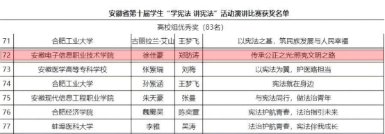 热烈祝贺安徽现代信息工程职业学院信息工程系朱天豪同学的作品《与宪法同行,做法治青年》在安徽省第十届全省学生“学宪法 讲宪法”活动演讲比赛中获高校组优秀奖!