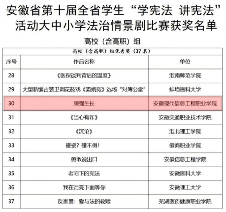 热烈祝贺安徽现代信息工程职业学院艺术建工系姚佳艺、陈露露、金永含雪、杨妍、杨烨、朱思彤、黄远灏7位同学的作品《顽强生长》在安徽省第十届全省学生“学宪法 讲宪法”活动大中小学法治情景剧比赛中获高校(含高职)组优秀奖!
