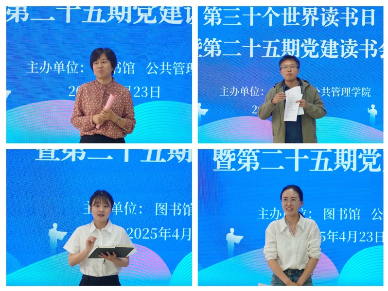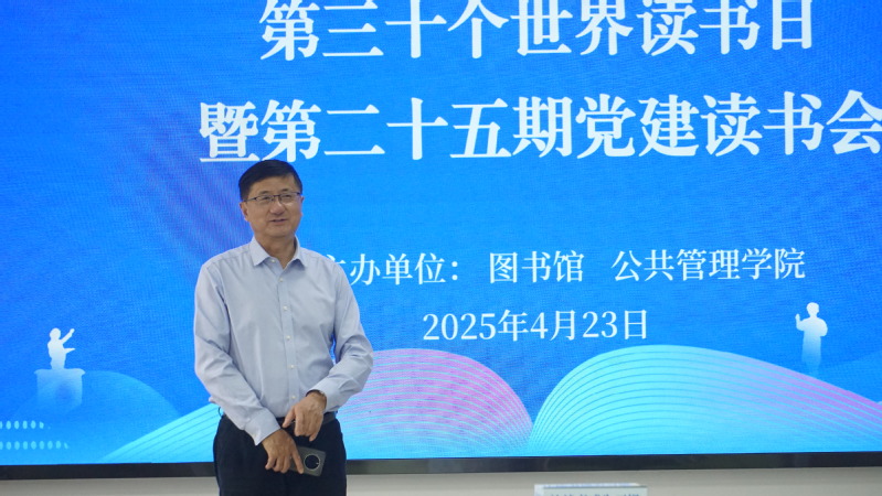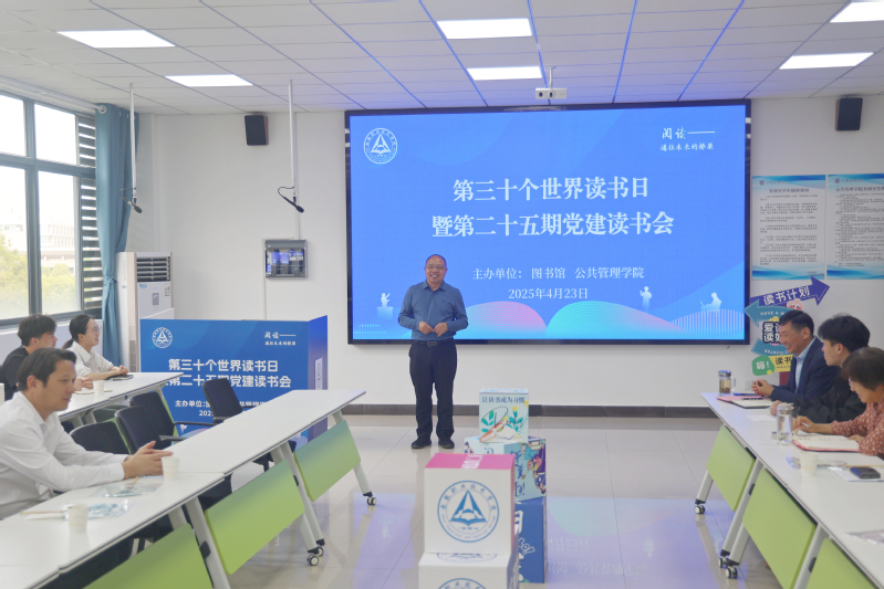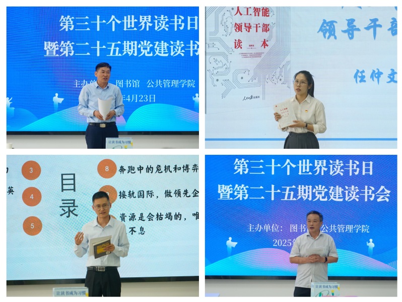 4月23日,学院在至朴楼数智人力综合实训室举办第三十个世界读书日暨第二十五期党建读书会,本期读书会由图书馆和公共管理学院联合举办,公共管理学院青年教师周安琪、王俊峰分别为大家分享《人工智能领导干部读本》《任正非:什么时候出发都不晚》读书心得。学院领导班子成员与90多名书友共同参加,读书会由公共管理学院院长主持。