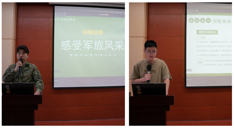 宣讲会还邀请了学院优秀退役士兵龚宇豪、王宇昕两名同学,分享他们的军旅经历。他们讲述了在部队中从青涩到成熟的蜕变过程,分享了训练中的酸甜苦辣、执行任务时的难忘瞬间,以及军队生活带给他们的成长与收获。让同学们更加直观地感受到军队生活的魅力,激发了大家的参军热情。
