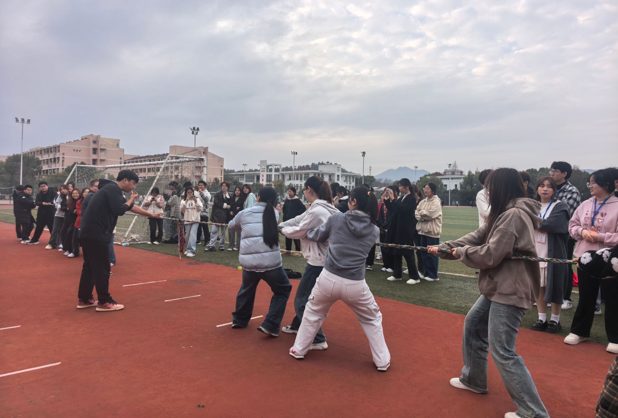 拔河比赛拉开了比赛的序幕,2023级特殊教育专业和2024级教育技术专业开展了第一轮的较量,辅导员也踊跃参与。后续轮次比赛活动依次展开。围观师生的加油声、呐喊声此起彼伏,热情满满。