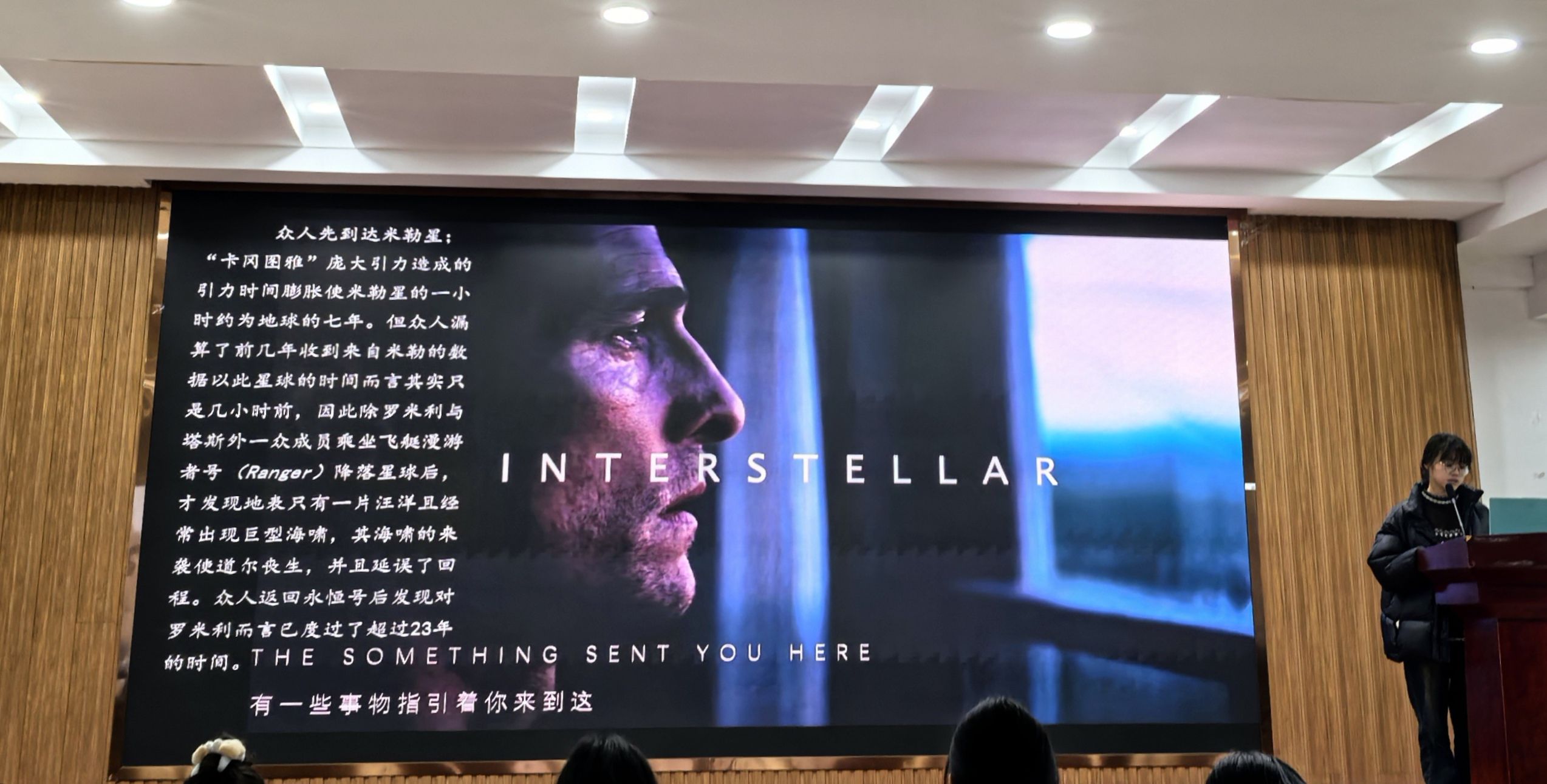 本次苍穹书语会分为两部分。首先是“科幻映宇宙:《星际穿越》点燃科学思辨”主题分享。协会成员潘婉灵结合《星际穿越》经典片段,生动解析了影片中黑洞模型、五维空间、虫洞理论等科学设定,通过幻灯片演示了“卡冈图雅”黑洞与三维空间穿越的视觉奇观,并引导现场同学们思考人类在星际移民中的伦理困境。