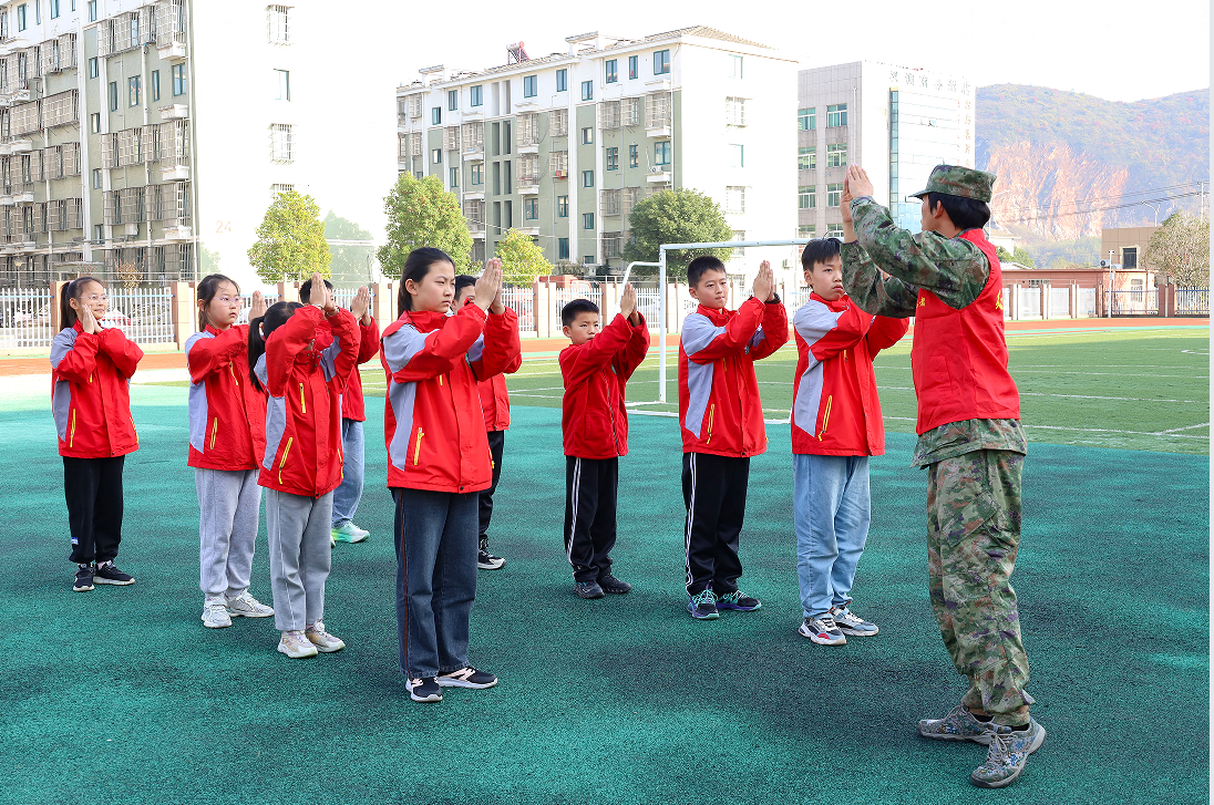 马步稳扎稳打、出拳虎虎生威、踢腿凌厉有力……操场上,四位退役复学的学生身躯挺拔,动作连贯流畅,共同展示出一套气势磅礴的军体拳。整齐划一的步伐,铿锵有力的号令,引得了现场学生们的阵阵掌声。“他们身穿军装,打拳时的飒爽英姿让我印象深刻。”大龙山中心学校501班的尹瑞涵感叹,尽管课堂上老师曾为她们播放过关于部队军人的纪录片,但今天亲眼看到这一场景依然让她感到十分震撼。“两脚跟靠拢并齐,两脚尖向外分开约60度”“五指并拢自然微屈”“两臂下垂自然伸直”物联网工程专业2021(1)班的祝东豪向学校国旗护卫队的学生演示基本的队列动作,并耐心地纠正着每一位少先队员的动作细节。“队列动作不仅仅是外在的形式,更是内在精神的体现。”祝东豪表示,这些看似简单的队列动作对于培养学生们的纪律性和集体荣誉感有着不可忽视的作用。