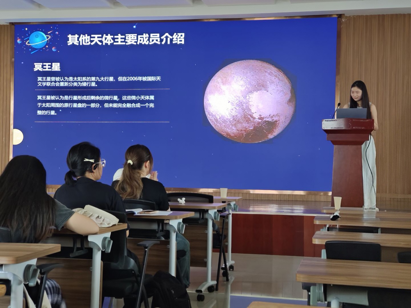 活动伊始,协会理事张启玥同学带来《太阳系的秘密》主题分享。她以生动的语言、丰富的图片,详细介绍了太阳系的八大行星,从水星的炽热与神秘,到海王星的遥远与深邃,让同学们领略到太阳系各成员的独特魅力。而太阳系的形成与演化知识,解开了太阳系的神秘面纱,使同学们对人类所处的宇宙家园有了更深刻的认识。