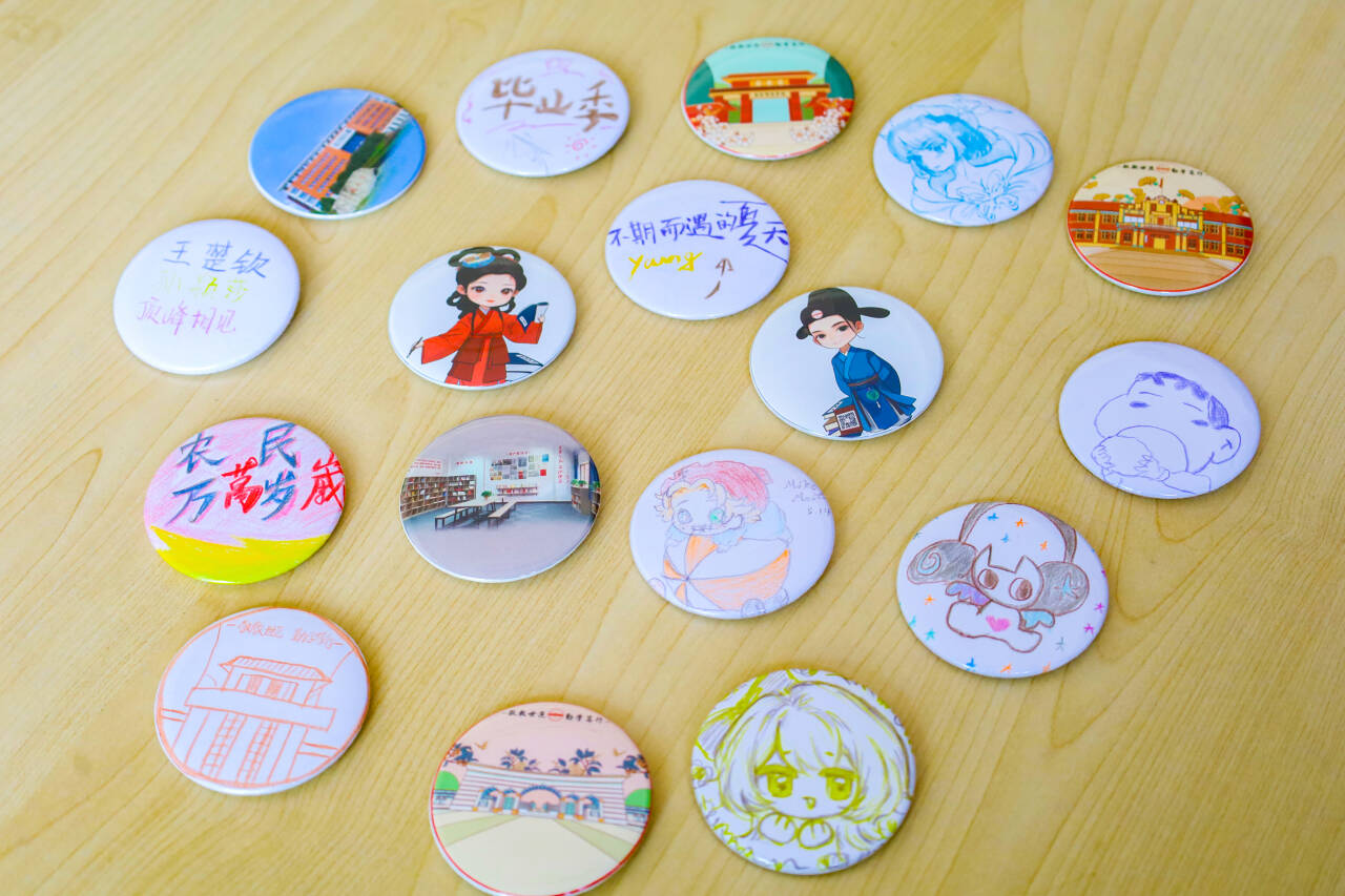 先用铅笔勾勒轮廓,再用彩笔填色,而后叠加阴影层次。经过学生们的精心构思,红楼、敬敷书院、黄梅戏卡通人物等元素被巧妙地融入徽章图案,制作而成兼具传统韵味与青春活力的独特徽章。这些元素不仅是校园景致与文化符号,更承载着学生们在校园的学习生活记忆。