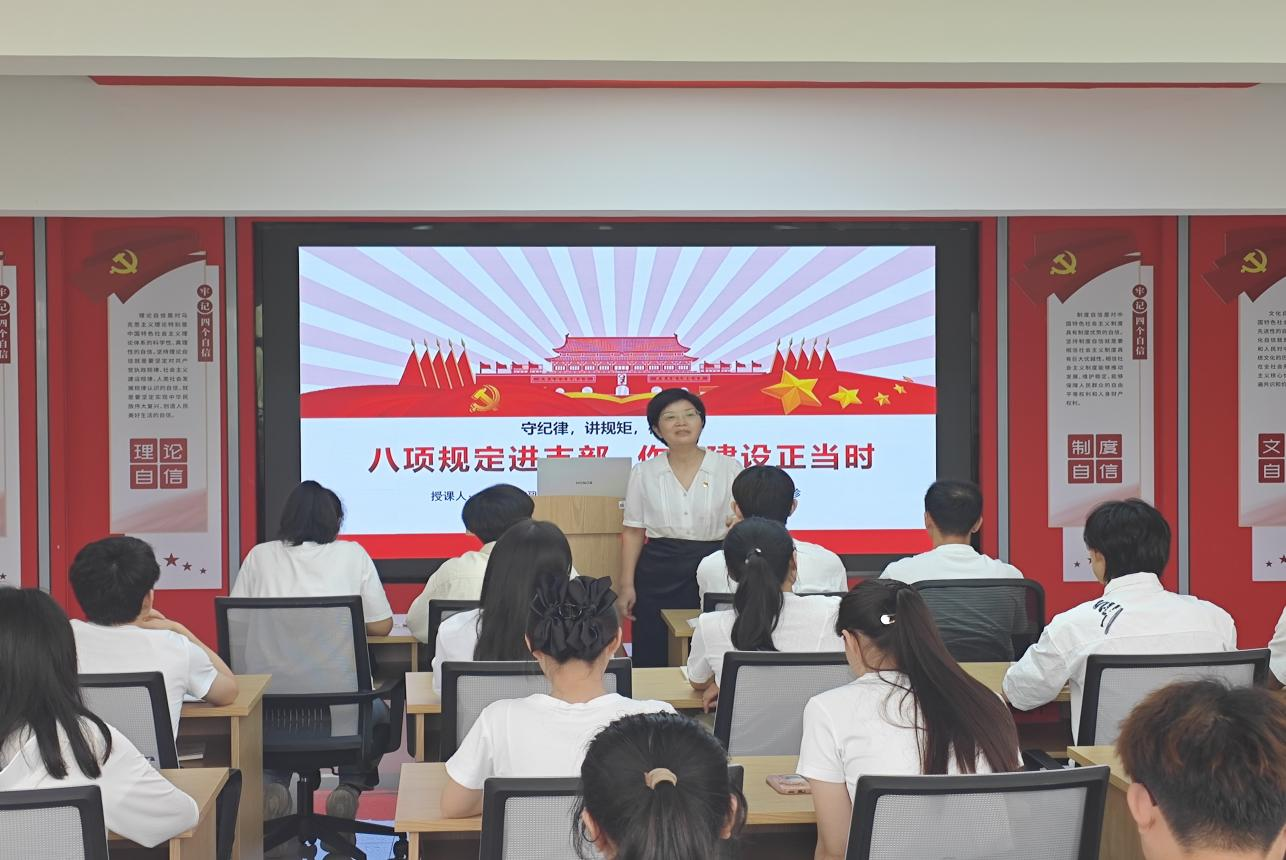 数理学院党委副书记彭芳珍以“八项规定进支部 作风建设正当时”为主题为同学们讲授专题党课。她围绕中央八项规定具体内容,深入浅出地阐释了纪律规矩的内涵与实践要求,作风建设的重要性;讲解违反中央八项规定精神的主要表现,以真实案例敲响警钟。她指出,学生党员作风建设是筑牢理想信念根基、发挥先锋模范作用、引领校园清风正气、培育新时代德才兼备人才的根本保障。新时代的学生党员一定要强化责任与担当,带头“守纪律、讲规矩、树新风”。