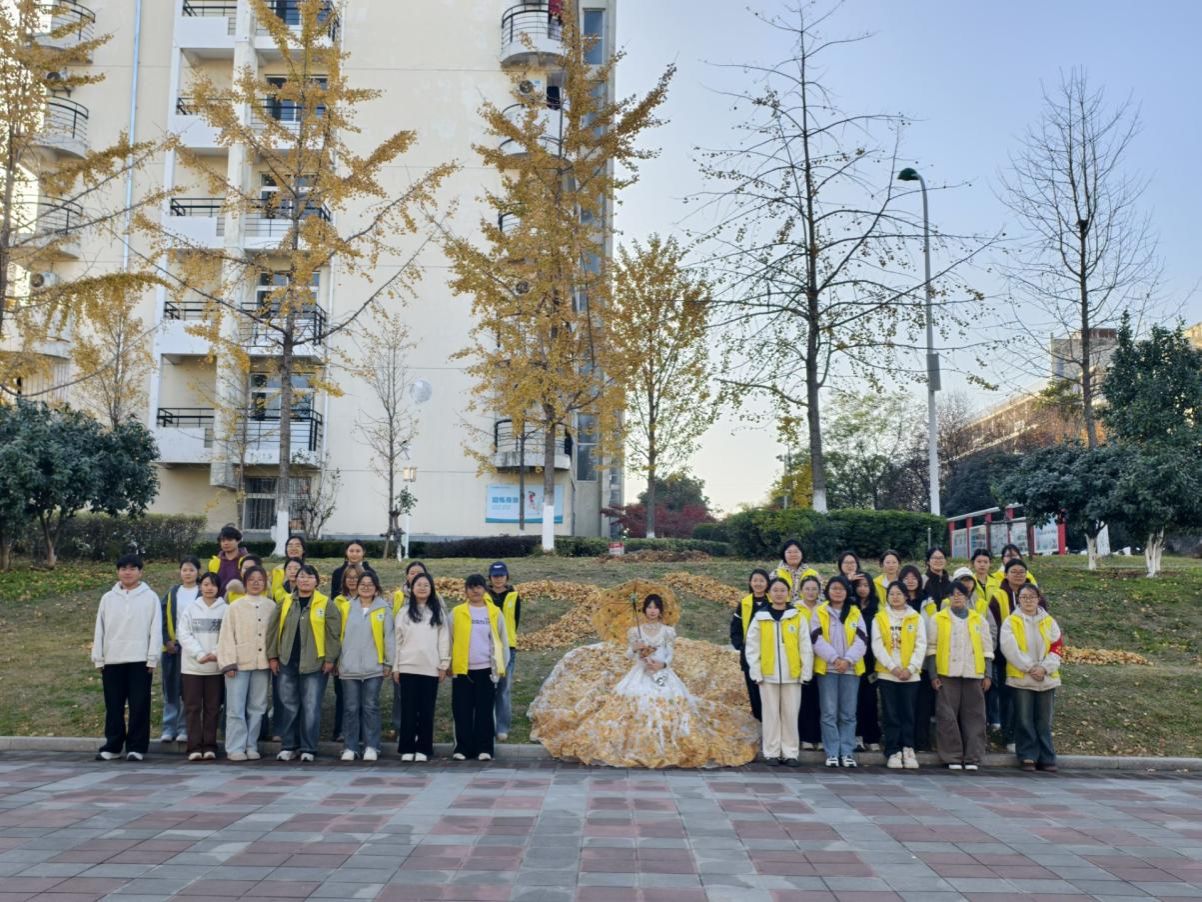 现场分工有序、协作紧密:清扫组的同学们戴好手套,手持铁耙、扫帚,弯腰将草坪与步道上的落叶逐一归拢;创意摆拍组用收集的形态完整的银杏叶在杏林路空地上创作,让叶片的创意组合成为校园里最具温情的创意景观;树木养护组小心翼翼地手持毛刷,将保护剂均匀涂刷在树干上,每一笔都力求规范细致。尽管初冬微寒,却丝毫未减同学们的劳动热情,大家相互配合、干劲十足,劳动的身影成为校园里一道温暖的风景线。绿化师傅与安保人员全程巡回指导,及时纠正操作细节,既保障了活动安全高效推进,也让同学们在实践中真正掌握了绿化养护技能。
