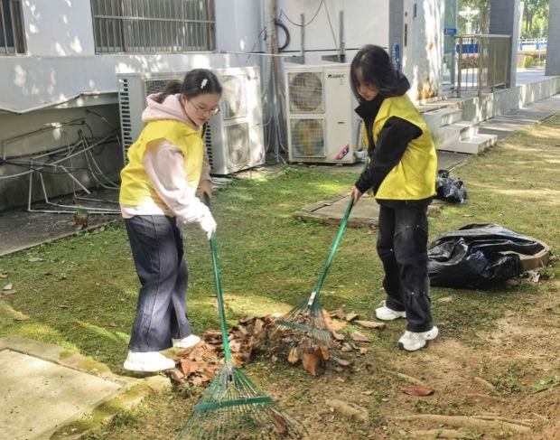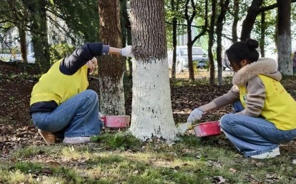 初冬的校园,落叶铺陈,恰是校园绿化养护与创意实践的绝佳时机。活动伊始,物业绿化负责人以“理论+实操”的形式,向同学们系统讲解冬季树木养护要点:从树木“涂白”防寒防虫、防枝干冻裂的核心作用,到落叶清扫的分类技巧、安全巡查的重点区域,讲解细致入微。明确任务分工与安全规范后,在绿化师傅、物业人员的带领下,同学们迅速化身“校园护绿使者”与“创意设计师”,投入到热火朝天的劳动中。