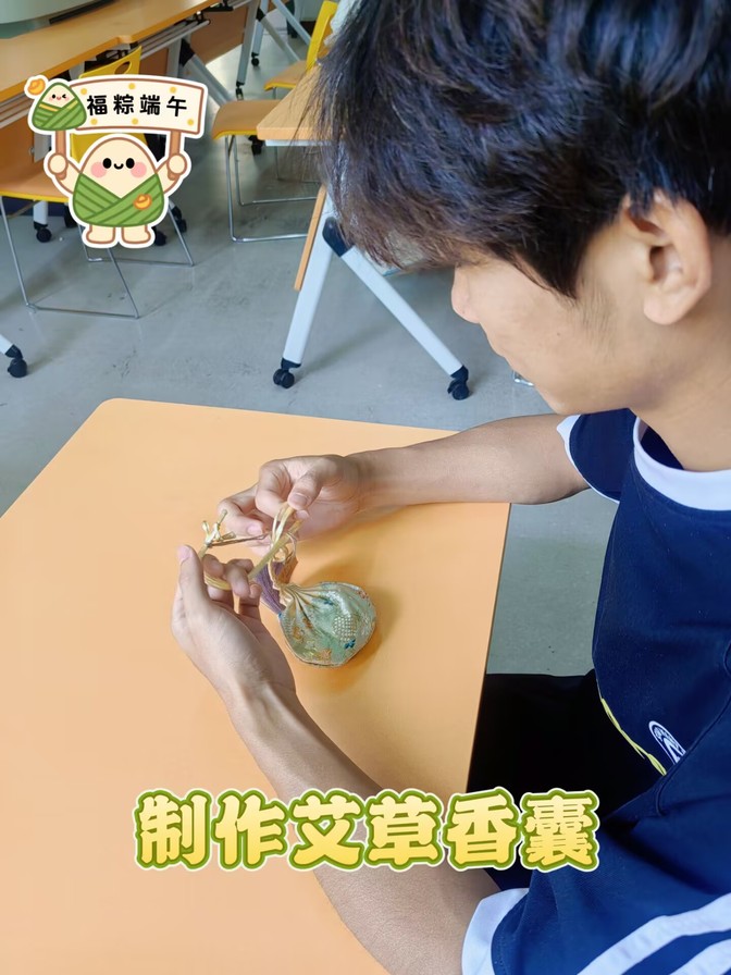 指尖飞舞,巧制安康。端午节佩戴香囊有“驱虫防疫、祈福纳祥”的美好寓意。22级团支部发挥创意,从穿针引线再到填充艾草、缝制香囊,每一个步骤都凝聚着专注,每一针每一线都饱含着对传统文化的热爱。在大家的巧手下,一个个造型别致、香气四溢的艾草香囊相继诞生。
