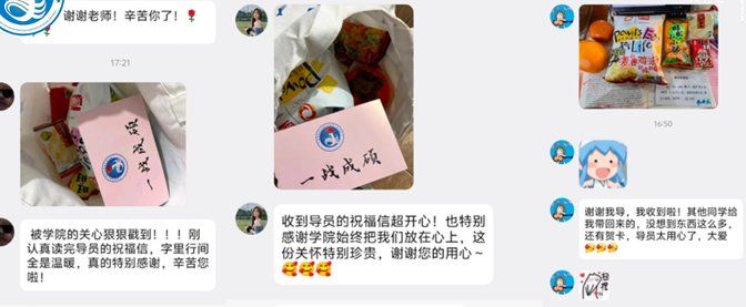 暖心礼包:细节传递温情,祝福化作力量。活动现场,学院领导、辅导员及教师代表为考研学子发放定制慰问礼包。礼包内含寓意“考试顺利”的旺旺礼品套装、心想“柿”“橙”的水果组合套装、承载学院殷殷期盼的“盼盼”牌小零食、镌刻“芯语心愿 一战成硕”的定制手提袋。一份礼包,十分心意,百分祝福,学院用爱心暖心为考研学子注入冬日暖流。
