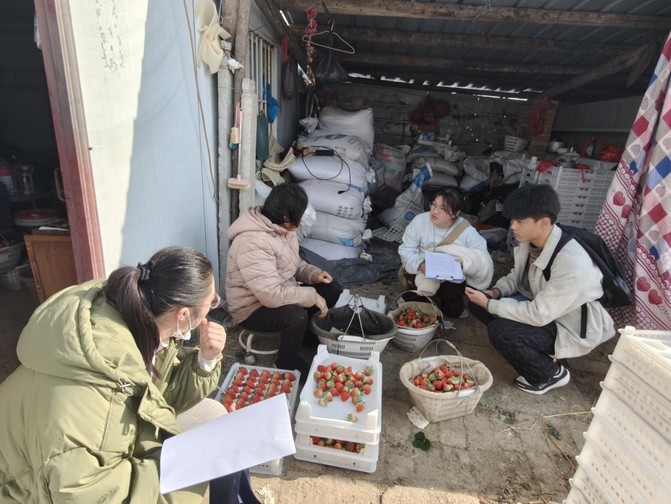 为引导大学生投身基层建设、服务家乡发展,材料与化学工程学院组织开展 2026 年寒假 “返家乡” 社会实践活动。1月16日,由合肥籍学生为主组成的 “莓” 好青年调研团,在陈艳文和王芹老师的带领下,走进合肥市长丰县水家湖镇,聚焦当地草莓销售现状与产业发展开展调研活动。调研团采用实地考察、深度访谈与问卷调研相结合的方式,先后走访安徽果之道供应链有限公司、福临农农业科技有限公司及 6 家草莓种植户,系统梳理长丰草莓从田间到餐桌各环节的运行逻辑,精准挖掘产业发展中的现实痛点。