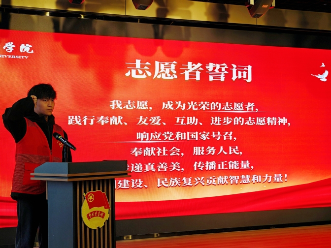 活动伊始,现场播放了2025年志愿服务活动总结视频,一幕幕暖心的服务画面生动展现了蚌院志愿者的责任与担当,也让在场人员重温了志愿服务的温暖与力量。青志联副会长陈炜琪作为志愿者代表宣读《学雷锋志愿服务倡议书》,发出践行雷锋精神、积极参与志愿服务的号召,呼吁全校青年学子以实际行动传承志愿精神;校学生会主席魏修洋带领全体志愿者庄严宣誓,铿锵的誓言彰显着志愿者们践行初心、无私奉献的坚定决心。