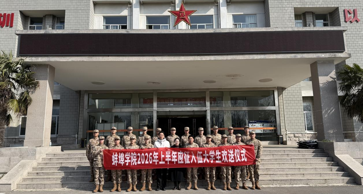 3月13日上午,我校2026年春季大学生应征入伍欢送会在蚌埠市国防教育基地举行,为即将奔赴军营的春季入伍大学生送行。学校党委学生工作部部长赵思莉、蚌山区人武部副部长张少辉、相关工作人员及入伍新兵参加本次欢送仪式。