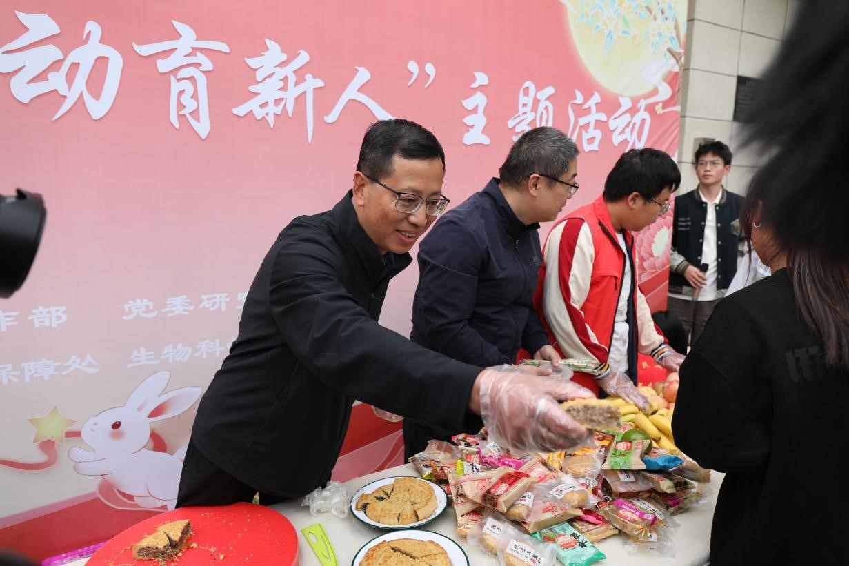 10月1日中午,南苑、北苑、西苑、合苑餐厅门口人头攥动、热闹非凡。校领导东·华尔丹、保文星、黄永东、毛建东及相关部门、学院负责人一起为同学们发月饼、苹果和学校餐厅精心烹制的鱼肉,共度国庆中秋佳节。