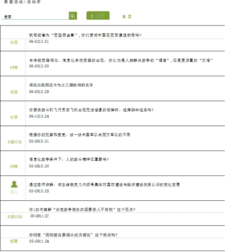 学习通在线学习平台是本校国防类学生社团成员进行国防教育的重要渠道。历经课前、课中、课后三个阶段,形成完整学习闭环。课前教师利用学习通平台资料,督促学生完成预习任务,并针对个性化问题和普遍问题进行指导;课中通过学习通签到、选人、抢答等功能了解学生的预习和学习情况,同时通过在线调查、主题讨论、作品展示等课堂活动功能的适时运用,增加与学生的交互环节,激发学习主动性;通过查看课堂即时练习、作答稿件、学习进度等功能,随时了解学生的学习状态及学习效果,提出意见建议;课后通过学习平台即时完成评价反馈,帮助教师调整教学策略,提升教学质量。线上课程信息资源覆盖全面、类型丰富、内容多样。课程资源总数223个,含视频、文档、图片、动画等;习题577道,考试试题631道,完全满足混合教学需要;其他基本信息规范,符合高职学生学情特点及职业教育发展规律。2025年完善五大拓展性资料案例库,还有在线网站链接、新闻推送、在线阅读书籍、在线图书推荐等线上拓展资源,增加电影资料、记录片资源等,具有多样性、趣味性、前沿性的特点,满足学生线上自主学习。总体更新率每年不低于10%。常态化更新教材、讲义、课件、题库、视频文档等在线资料;完善军地、校企、校地合作,共建共享在线资源;将实践教学平台孵化出的学生实践成果、第二课堂素质培育成果等数字在线资源及时充实。