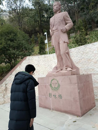 彼时的彭咏梧烈士陵园,苍翠的松柏闪烁着英雄的毫光,烈士的雕像威严矗立,仿佛能够感受到他炽热的心脉铿锵有力地跳动。看见身前的青年摇旗呐喊,感受到他胸腔里的爱国之情滚涌若潮。我理解了一个人真正的光明并不是呆在光明之中,而是从远处凝望光明,朝他奋力奔去,就在那拼命忘我、实现个人与民族的理想过程中,感受到的生命的充实。在奉献自我、建设祖国的道路上不辍耘。