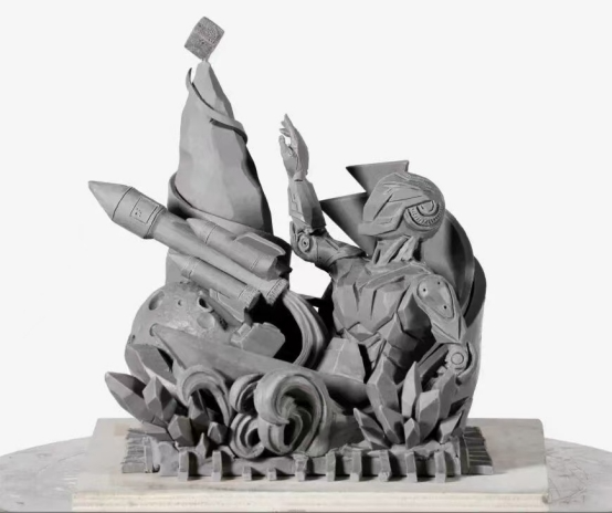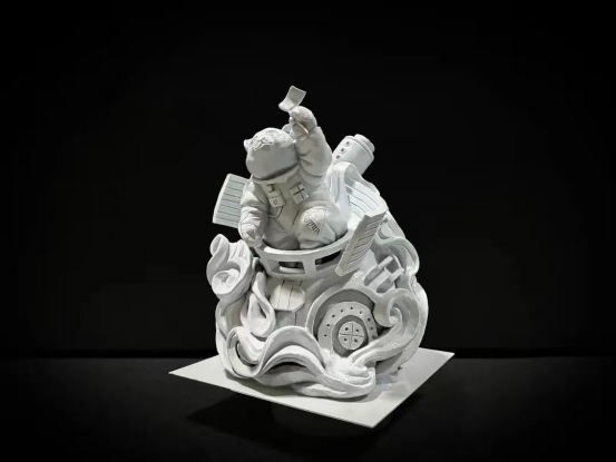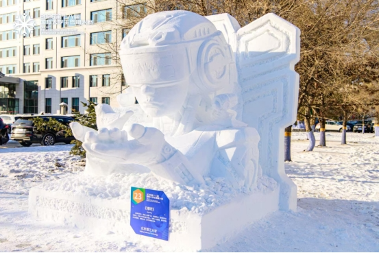 “《倾听》的设计初衷,是想借艺术语言传递我们青年一代的时代思考。作品以人机造物为造型主体,机械臂以仿生弧度轻托飞鸟,灵雀栖落金属肩隅,凝神‘倾听’自然生命的絮语,体现了赛博空间与现实的交融。设计理念融合了国家重点领域的学科特色与‘科技向善’的价值追求,诠释了科技不是割裂自然的利刃,而是守护生命与和平的羽翼。”雪雕队队长、设计与艺术学院2024级硕士研究生张龙介绍道。