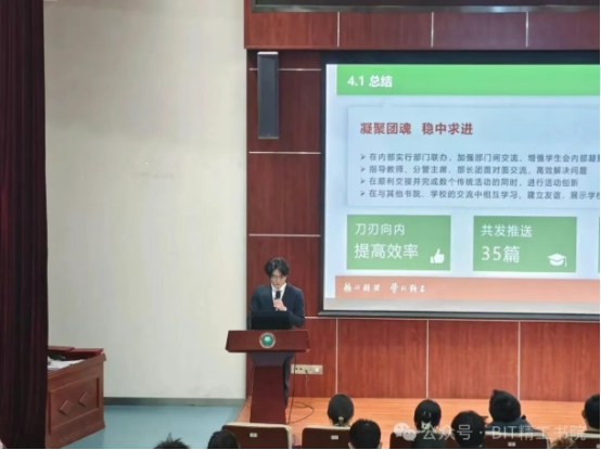 学生会主席李夏雨同学围绕文体活动、权益生活、学生交流三个板块总结了学生会的工作成果。并秉持凝聚团魂、稳中求进的工作态度,做出未来的展望。