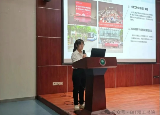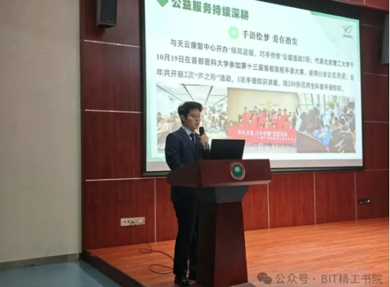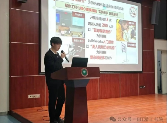 “精工深耕结硕果 科创笃行启新程”。学生科技爱好者协会会长荀九炎同学围绕科创育人成果,简述“精制工坊”、大创双选会、SolidWorks软件培训等科创活动,生动展示了科协以科创宣传与人才培养为核心的工作宗旨,并展望未来工作。
