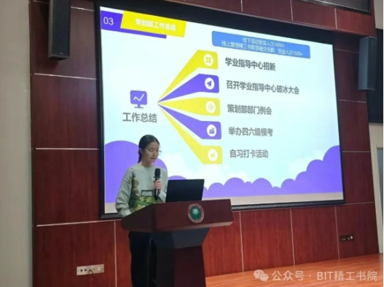 学业指导中心主席陈雪原同学以组织帮助书院同学学业的目标,展开介绍了日常答疑、自习打卡、期末串讲等活动,体现了学业指导中心围绕学生学业需求,多维度提供指导服务,助力学子成长的工作成果。