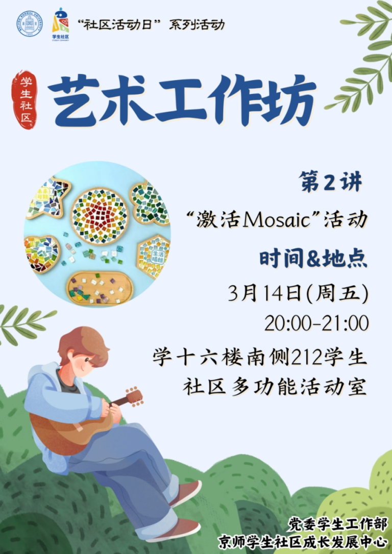 京师学生社区成长发展中心拟举办艺术工作坊第2讲“激活Mosaic”活动。马赛克一词源于古希腊,译自Mosaic,原意是用镶嵌方式拼接而成的细致装饰,应用在墙壁面或地板上的绘制图案表现的一种艺术。活动旨在帮助同学们将内心想法通过实践转化为生动有趣的马赛克杯,释放日常学习与生活中的压力,疏解心绪,表达自我。