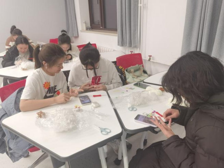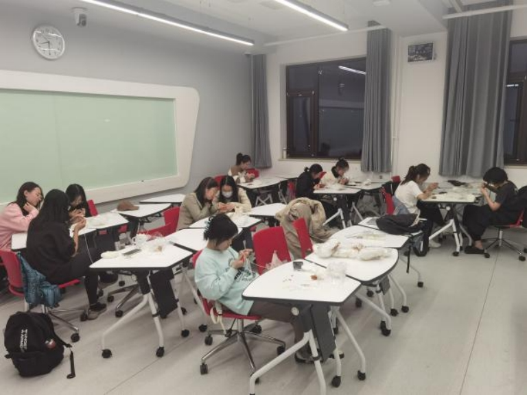 再接再厉,同学们埋头苦干,可爱的“小饺子”在她们灵巧的手指间渐渐有了雏形。两个小时过去,经过同学们坚持不懈的尝试与努力,活灵活现的“小饺子”在她们手里诞生了!互相分享着成功的喜悦,大家用手机记录下创作的美好。