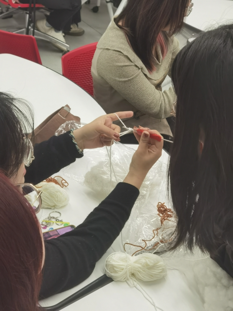 相互鼓励着,大家开始动手尝试。起初,一部分同学在起针环节无法顺利开展,有些信心受挫。但是怀着为心智障碍者送上手作礼物的迫切愿望,他们积极请教老师、主动上网搜集资料,终于克服了缺乏经验的困难。