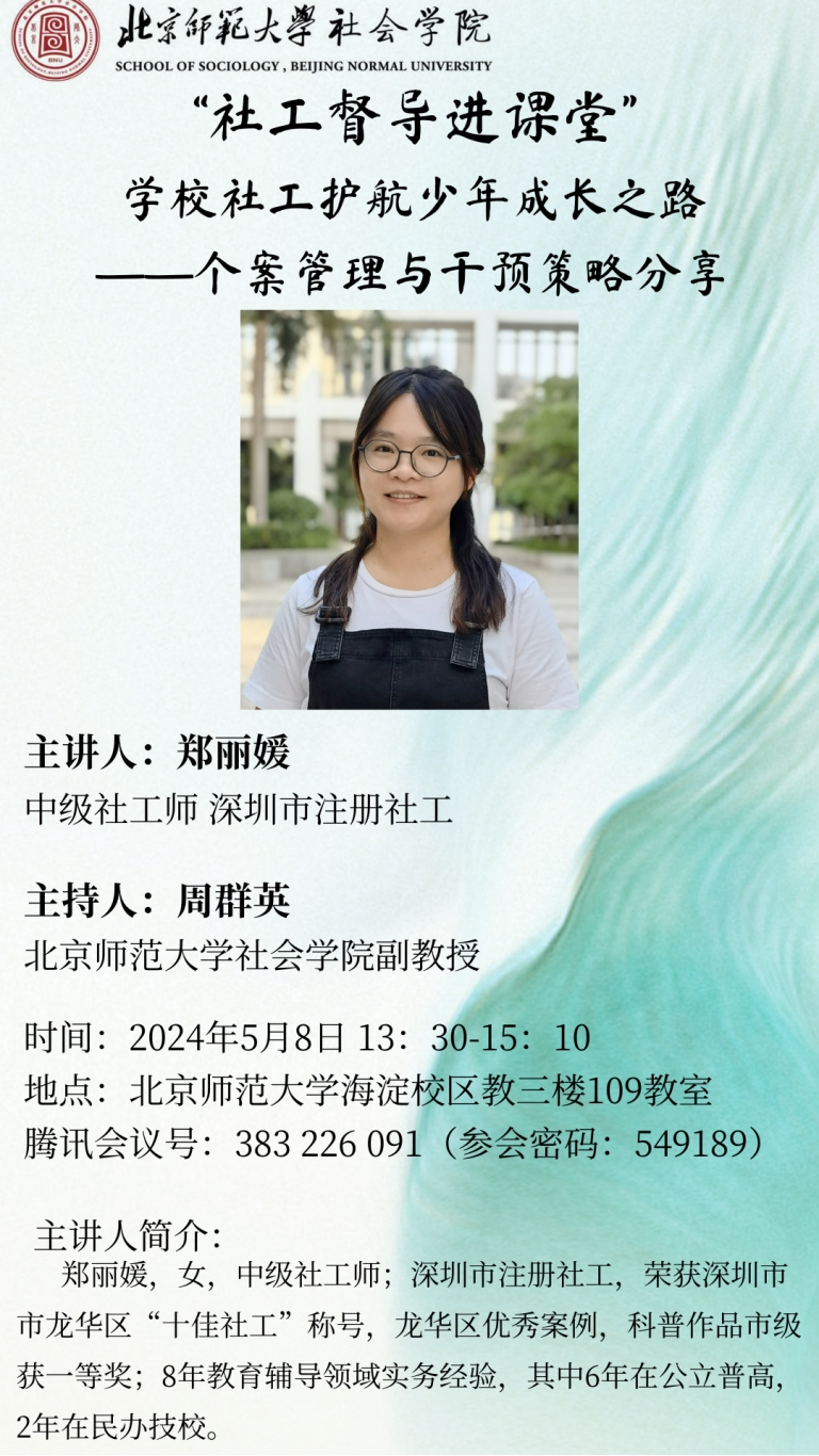 院(系)社区活动丨讲座预告 “社工督导进课堂”:学校社工护航少年成长之路——个案管理与干预策略分享