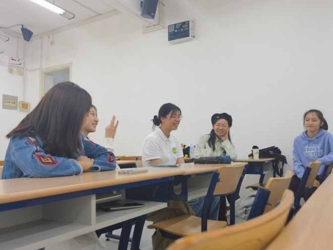 活动开始时,时老师首先进行了一个简单轻松的小游戏,缓解了大家的紧张情绪,教室里渐渐有了欢乐的气氛。由于人数有限,老师让所有人共同成立一个大组,并推选出组长。组长带领大家创造了组名以及组规,课堂进入正式的活动环节。