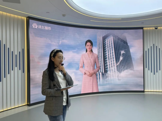 活动伊始,科大讯飞参访专员为师生们介绍了公司旗下的明星配音产品讯飞智作,该产品可以作为AIGC内容生成平台,提供智能配音、虚拟主播等功能。