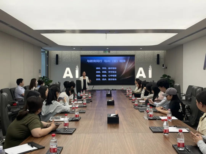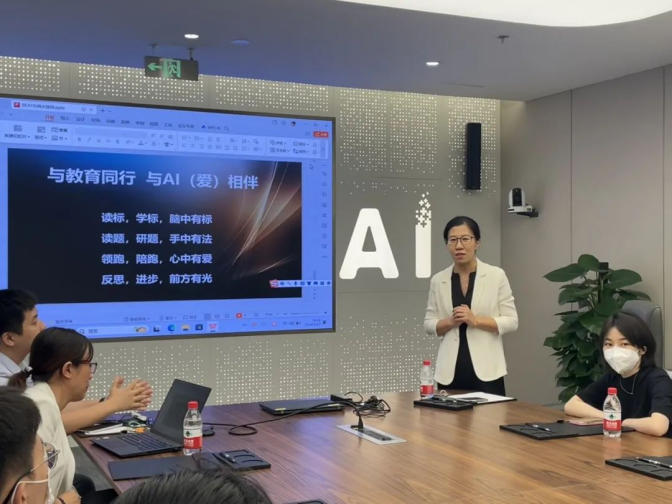 参观结束后,科大讯飞AI英语应用教研院院长胡慧敏和科大讯飞教育考试与语言学习产品线北京市场总监杨树佳为同学们详细介绍了AI数智赋能英语教与学的理论与实践。胡慧敏院长指出,国家高度重视教育的数字化转型,科大讯飞深耕数字教育领域多年,其智能语音评测技术以及智能教学助手目前已经在多地投入使用,在未来也欢迎北师外文学子加入本行业。