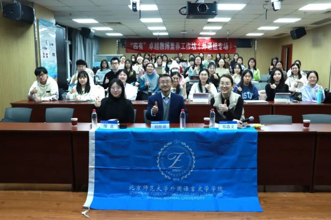 2024年12月13日晚,外国语言文学学院在后主楼914会议室举办“四有”卓越教师素养工作坊(英语组专场)第六期。清华大学附属中学刘桂章老师受邀担任本次活动的主讲嘉宾,外国语言文学学院党委副书记郑淼文老师主持本次活动。