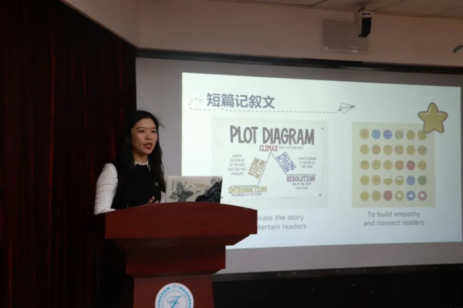 接着,叶老师就短篇记叙文与原版小说的教授分享了她入职七年的“打怪之路”。叶老师表示,记叙文类文本的教学设计,应关注故事线和情感线。其中,情感线尤为重要,体悟故事中的情感变化过程有助于培养读者的共情能力,建立其与角色以及周围人之间的同理心。