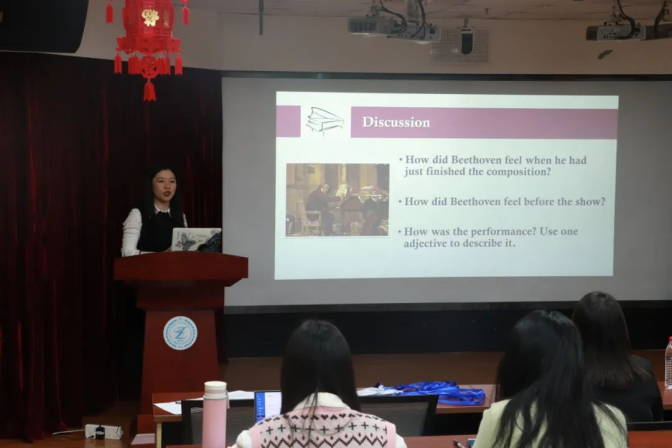 叶老师生动地将短篇记叙文的教学活动比作“舞台”,并提出了宝贵的建议:在备课的过程中,不要以教师视角去阅读,而要把自己代入普通读者的身份。随后,叶老师以“Spring Festival”和“A Musical Genius” 两个公开课为例,详细地介绍了短篇记叙文的授课过程。叶老师表示,短篇记叙文的设计主要依赖于教师两种身份的建构:一方面,教师需要像“导演”搭建舞台一样,充分利用好一切资源,搭好脚手架;另一方面,教师需要像“演员”演戏一样,沉浸式备课、上课,不吝于分享个人故事及情感。