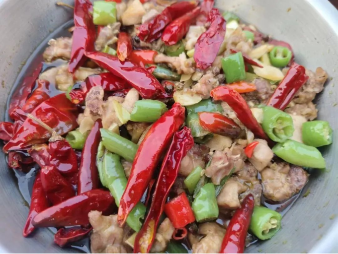 超火的经典菜品青椒霸王兔,食在四川,味在自贡。①准备一只兔子,砍条切坨,加调料腌制。②起锅加油,六成油温下兔子,炒干水分后下蒜粒和青椒。③再下剩余青椒、红椒和调料,翻炒均匀,最后加花椒油出锅。鲜辣江湖菜,开胃下饭,辣得过瘾。爸爸妈妈直呼巴适!