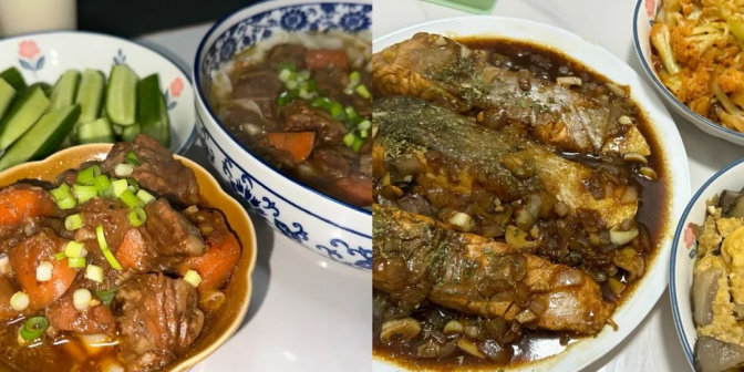 我炖红烧牛肉有几个小技巧,一是牛肉焯水后撇去浮沫、保留原汤,用牛肉原汤炖煮,肉香更加浓郁;二是加入半个切块的洋葱,最后洋葱融化,取其鲜甜;三是全程小火慢炖,煨六个小时才能肉质软烂;四是少许黄豆酱和甜面酱调味,增加浓厚的酱香。照烧三文鱼相比之下就非常快手了。这两道菜都广受家人朋友的好评,看到大家吃得开心,我也特别有成就感。