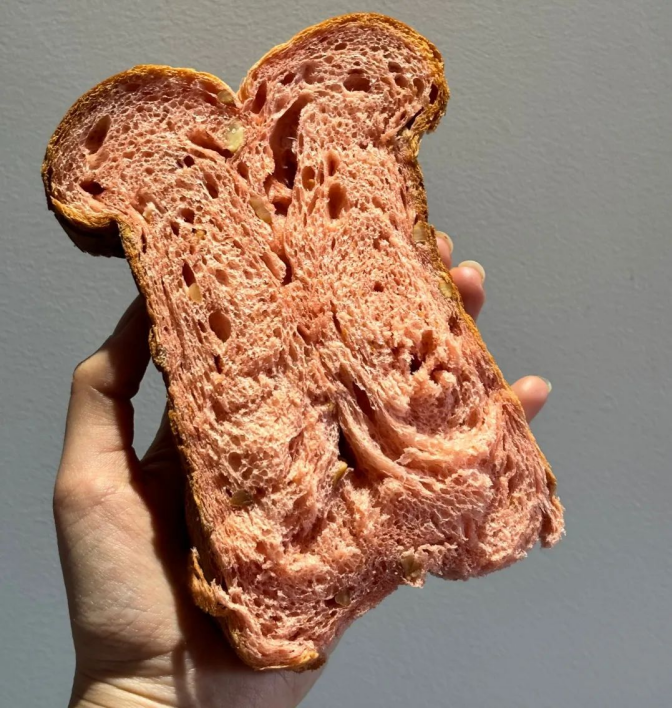 吐司口味的灵感来源于拜年时吃到的椰蓉腰果,为避免打面时面筋因辅料多而断裂,制作时就用椰子油代替了椰片,用玫瑰粉代替了玫瑰花瓣。出炉的吐司坚果香和椰香非常浓郁,面包体也因波兰种的使用而绵密柔软。