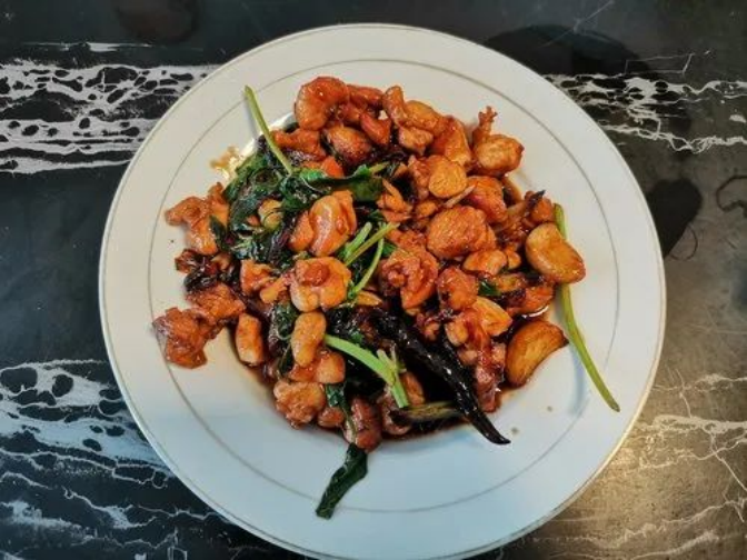 这道菜是台式三杯鸡,除去常见的调料外,最重要的配料就是罗勒叶。鸡腿肉切块腌制,锅中放油,先后加入香油、姜片、葱蒜、干辣椒、冰糖,最后加入鸡腿肉炒至变色,再加入老抽、生抽、水或米酒,收汁后加入罗勒叶就可以出锅啦!色香味俱全的台式三杯鸡就完成啦~