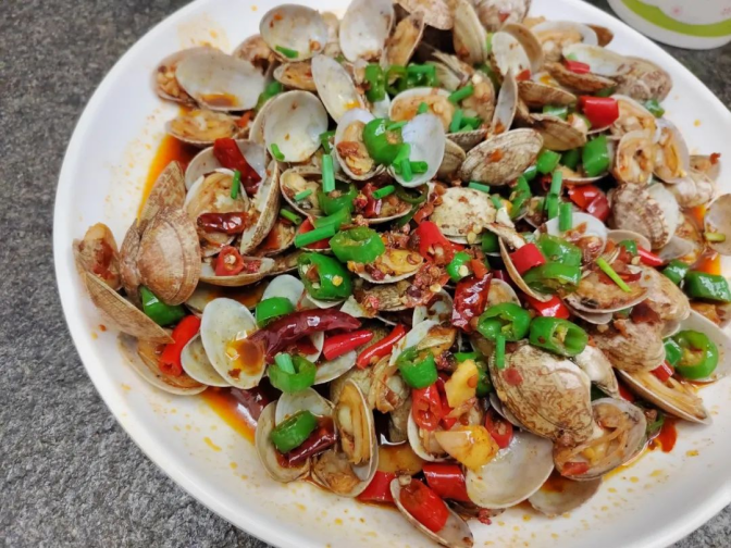 将花甲焯水后,热锅倒油,油热放入青红辣椒、生姜、蒜末,爆炒炒香后加入一勺豆瓣酱和一小块火锅料,炒出红油,倒入花蛤翻炒后,加调好的料汁,炒出浓汁,撒上香葱段,收汁后即可出锅。一道酱汁浓郁、香辣过瘾的香辣花甲就完成啦!