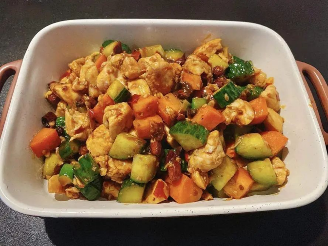 准备鸡胸肉、黄瓜、胡萝卜、葱姜蒜末、鸡蛋清、食用油、食盐、料酒、胡椒粉、鱼香汁、熟花生米等食材。将鸡胸肉切成小丁,加入蛋清、食盐、胡椒粉和淀粉抓拌均匀备用。起锅烧油,下入鸡丁滑炒后盛出,再下入黄瓜胡萝卜丁翻炒。加入炒好的鸡丁和熟花生米,倒入鱼香汁,翻炒均匀后即可出锅。这样,一道美味的宫保鸡丁就做好了!鸡肉鲜嫩多汁,搭配脆爽的花生米和香辣的调料,辛辣与微甜交织,令人回味无穷。