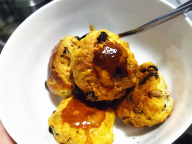 寒假终于有机会做了收藏了好久的葡萄干司康菜谱,把面粉、糖、淡奶油、泡打粉和葡萄干混合均匀就可以了。烤前在顶部刷一层蛋黄液,成品会非常金黄好看,还没出炉就已经满屋飘香啦~