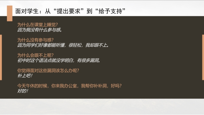 接着,王老师以老师们的“困惑清单”为主线,分享了4个自己和其他老师们在从教过程中曾遇到的困惑。第一个困惑是“学生不听话怎么办”。王老师以学生在课上睡觉怎么办这一问题为例,结合自己的亲身经历,分享了自己处理这一问题时从提出要求到给予支持的心路历程。