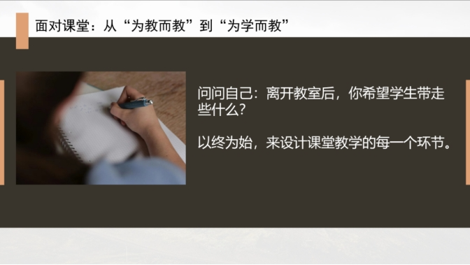 第二个困惑是“课上的不好怎么办”。王老师首先抛出了“什么是一节好课”的问题,介绍了自己对待课程从“为教而教”到“为学而教”的态度转变。王老师指出,教学既要向外走,不闭门造车;也要向内求,磨练内功。