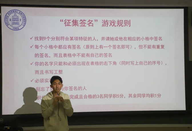 在主持人宣布游戏开始后,大家拿着纸笔纷纷出发,寻找符合特定要求的同学签名。这是一个快速打破隔阂,结识新朋友的绝佳机会!在游戏的驱使下,大家开始询问彼此的兴趣爱好等信息,不仅顺利完成了任务,也在过程中加深了对彼此的了解,找到有共同爱好的新朋友。