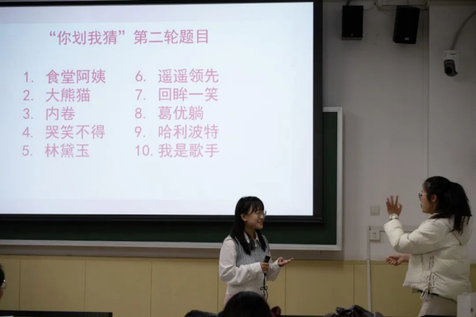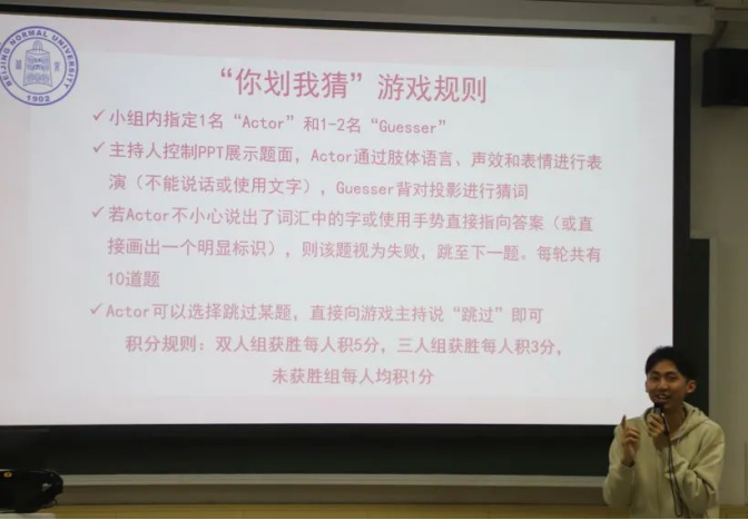规则简述:大家被分成三人或两人一组,大屏幕给出提示词,一人比划其余同学猜,有限时间内看哪组配合最默契,答对题最多,则获得相应积分更高!