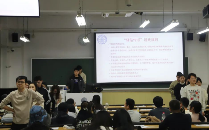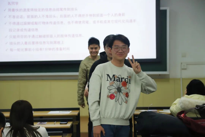 虽然游戏的进行是无声的,但大家还是能感受到在一片安静下的“暗流汹涌”。前方同学在焦急地等待信息传来,后方同学在不断确认对方传递的信息到底是什么,台下的同学也看得津津有味。在大家共同的努力下,最终信息成功传递。无论游戏成功与否,参与游戏的每一位同学都在为彼此间的愉快合作而庆祝,更重要的是,在游戏过程中大家更加熟悉彼此,又一步拉近了彼此的距离。