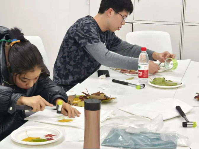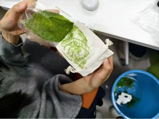 随后大家将一摞摞舒展的叶片从水中捞起,仔细擦干了表面的水珠,轻轻地放在帆布袋或香囊上。在认真设计了拓染布局之后,同学们用透明胶带将叶片固定住,拿起小锤子对叶子进行敲打。“铛铛铛——”有规律的敲击声充斥了整间屋子,植物的清香也在持续的敲拓下逸散到同学们的鼻尖。