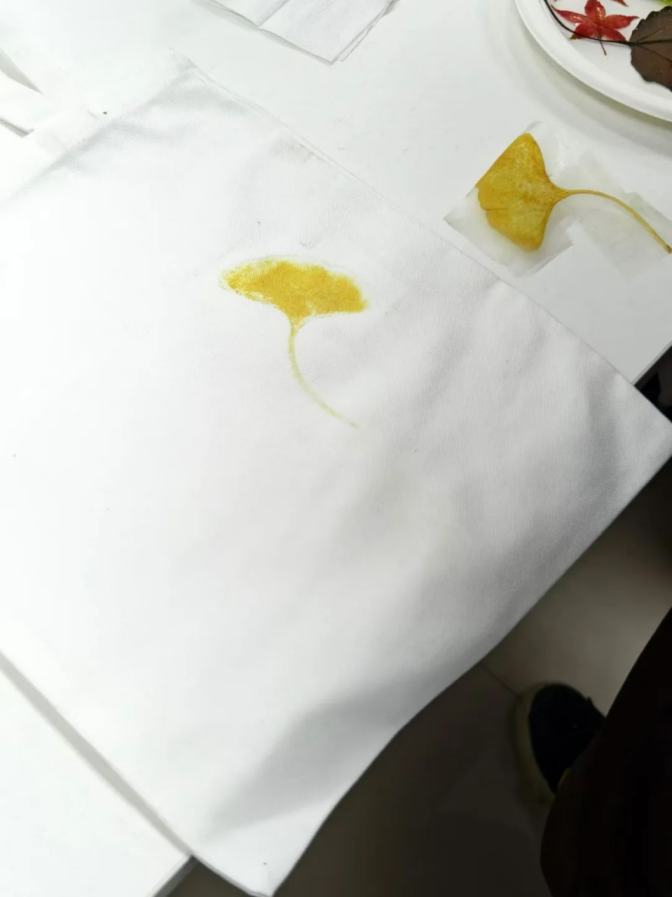 充分敲打后,同学们揭开透明胶带,收获自己的手工劳动成果。叶片分明的脉络延伸在帆布袋上,传递着同学们心灵的平静与安宁。